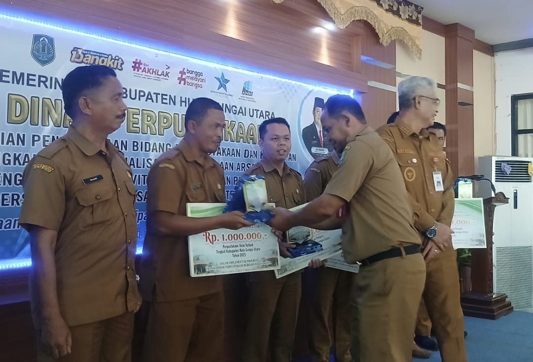 Penghargaan tersebut diserahkan langsung oleh jajaran Dinas Perpustakaan HSU kepada kepala desa setempat, sebagai bentuk apresiasi atas komitmen dan inovasi yang telah dilakukan.