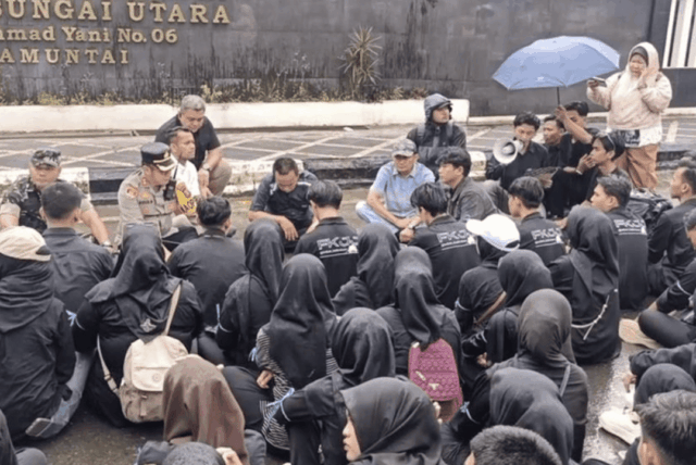 Meski diguyur hujan, massa tetap bertahan dan memulai aksi sekitar pukul 09.30 Wita. Mahasiswa memilih aksi duduk melantai di atas aspal di depan Kantor Kejari HSU, tanpa orasi berlebihan dan tanpa provokasi.