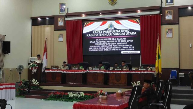 CakrawalaiNews.com, AMUNTAI – Bupati Hulu Sungai Utara (HSU) Sahrujani memberikan jawaban resmi atas pandangan umum fraksi DPRD, terkait Rancangan Peraturan Daerah (Raperda) Perubahan Kedua atas Perda Nomor 1 Tahun 2024 tentang Pajak Daerah dan Retribusi Daerah, dI Rapat Paripurna DPRD, Kamis (22/1/2026).