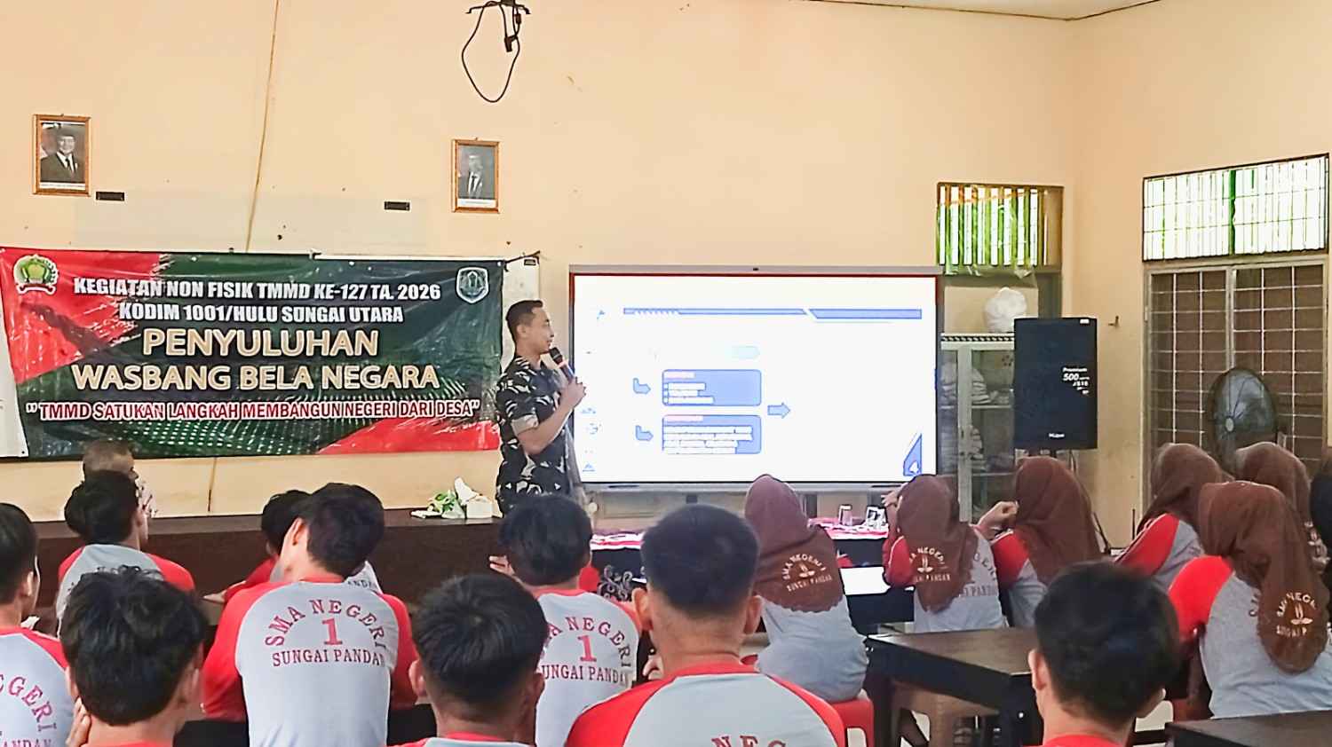 Komitmen itu diwujudkan melalui kegiatan Wawasan Kebangsaan di SMAN 1 Sungai Pandan, Kecamatan Sungai Pandan, Kabupaten Hulu Sungai Utara, yang disampaikan Bati Komsos Kodim 1001/HSU-BLG, Serma Mulyaman, Selasa (24/02/2026).